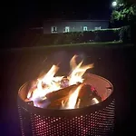 A pousada está equipada com chaleira elétrica, refrigerador e artigos de vidro para uma área de refeições ao ar livre e sala de jantar.
